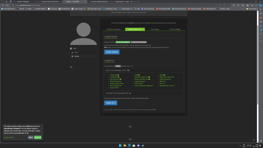 I just installed Pro mods today and keep getting this error Dependencies DLC missing also says the mods I am using are incompatible. I came back a few days ago after some time of inactivity and forgot how everything works. Already tried to verify data + re-check the DLCS "reinstalling" Nothing worked https://ibb.co/1z2fMr7 https://ibb.co/K2sPwJJ I still can play normally just cant play on promod servers