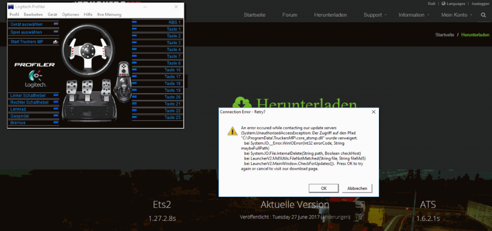 Guten Tag, die unten angehangene Fehlermeldung tut sich auf beim Versuch den neuen MP Starter zu öffnen. Dies mache ich über den Logitech Profiler. Hat bis weil immer prima geklappt nur jetzt nicht mehr. Den alten Truckers MP Launcher habe ich komplett deinstalliert bevor ich die Version launcher_1004 geladen und installiert habe. Dazu sind mehrere Versuche gekommen, nämlich einmal wo anders installiert, als das übliche Verzeichnis. Profil im Logitech Profiler entfernt und neu erstellt und Launcher nochmal neu geladen nachdem im englischen Forum davon berichtet wurde, das nun auch ATS ginge (was vorher möglicherweise ebenfalls schon mit der richtigen Version drin war) Alles zum Trotz kommt immer wieder die unten an gehangene Fehlermeldung. Mögliche Lösungsvorschläge? Danke schon mal im Voraus. PS Früher hat der Installer doch mal selber das Update durchgeführt. Man startete den Launcher und danach ging ein Fenster auf, das auf ein nötiges Update verwies. Dann lud man das runter und konnte starten... gibt es das jetzt nicht mehr?