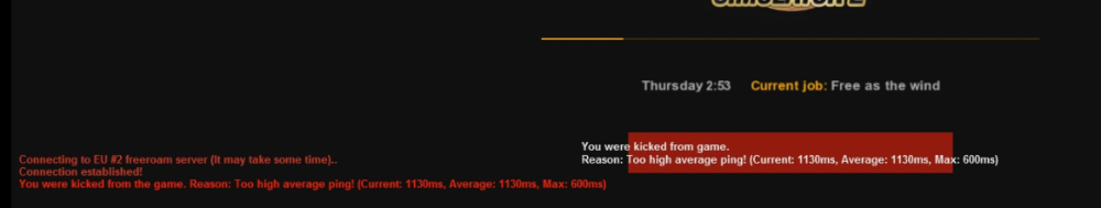 Suggestion Name: Add a set time-length for connections -- or force the connection to wait until the game has finished loading before the attempt is made. Suggestion Description: At the moment, trying to connect to EU2 is a joke. I was driving on it for at least half an hour today, then I get disconnected for seemingly no reason, and now I can't re-connect without being autokicked. Any example images: Why should it be added?: So people can connect to the server.