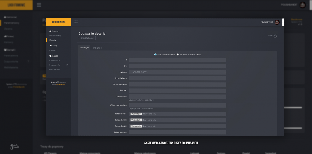 Witam wszystkich forumowiczów. Zajmuje się tworzeniem tachografów dla firm (systemy VTC - zarządzanie wirtualną firmą). Szukasz własnego systemu oddawania tras dla swojej firmy? Wszystko do dogadania, zainteresowani proszeni są o napisanie do mnie wiadomości prywatnej żeby dowiedzieć się więcej na ten temat. Tworzyłem systemy zarządzania firmą dla 3 wirtualnych spedycji, grafiki dla wielu osób i każdy jest zadowolony :) Przykładowy wygląd interfejsu oddawania zleceń: