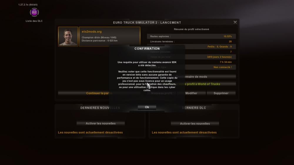 Bonjour, À l'ouverture d'ETS2 et ATS, solo ou MP, j'ai le message débutant part "Une requête pour utiliser du contenu avancé SDK a été détectée". Cela n'affecte cependant pas le jeu. Je crois que cela coïncide avec l'installation du mod Route advisor (pour avoir la carte mobile sur un autre écran). Je l'ai désinstallé depuis. Je ne sais pas s'il y a un lien entre les deux événements mais j'aimerais bien me débarrasser de cet avertissement. Quelqu'un a une solution? Merci.