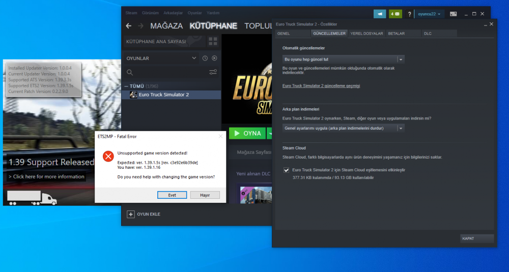 Steam beta sürümlerinin hepsini tek tek denedim her zaman versiyon hatası aldım 1 gün önce hata almadan oynuyordum. https://truckersmp.com/knowledge-base/article/26 Adresindeki çözüm yolarını denedim ama düzelmedi