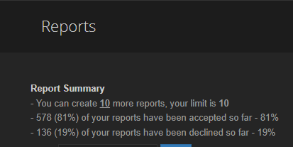 Suggestion Name: Show Quality of total Reports via Percentage of all submitted Reports Suggestion Description: Tmp already shows how many of your submitted Reports has been declined and accepted. Why not showing the actual percentage of declined/accepted Total Reports as a "summary". Maybe the way like the picture down below or maybe like at YouTube with the (dis-)/likes Any example images: Why it should be added: It would give you a more statistical view about your "Report Stats"